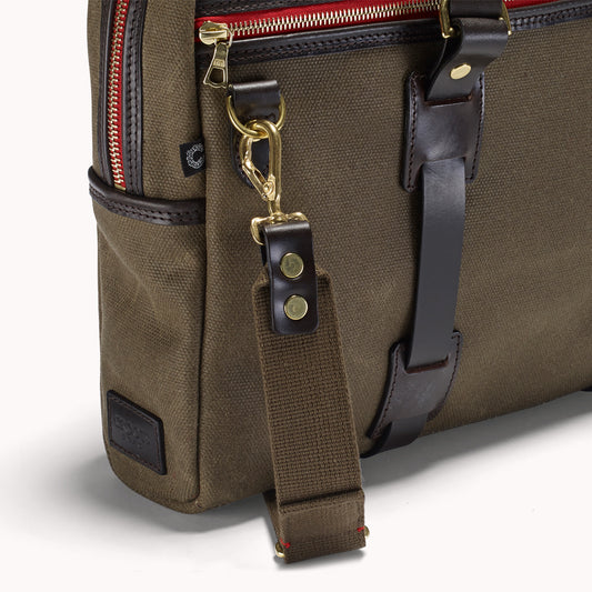 Gefertigt wird nach wie vor am Stammsitz in Malton, North Yorkshire. Auch die Materialien stammen fast ausschließlich von britischen Traditionsherstellern: Canvas aus Keighley in West Yorkshire, gewachste Baumwolle von Halley Stevensons aus Schottland sowie Metallbeschläge aus Walsall und Sheffield. Lediglich die hochwertigen Reißverschlüsse kommen von RiRi aus der Schweiz. Das Leder ist vegetabil gegerbtes *English Bridle Leather* – ein sattelfestes, langlebiges Material, das durch seine besondere Gerbung kaum nachgibt und für Gürtel, Zaumzeug und Sättel verwendet wird.